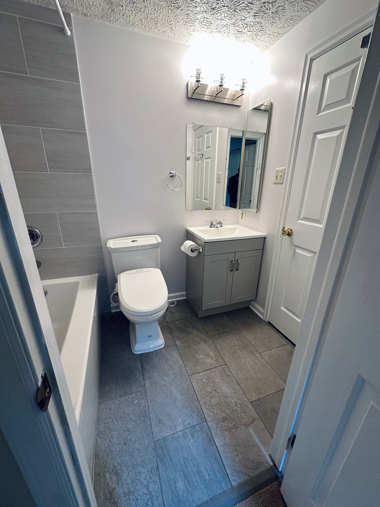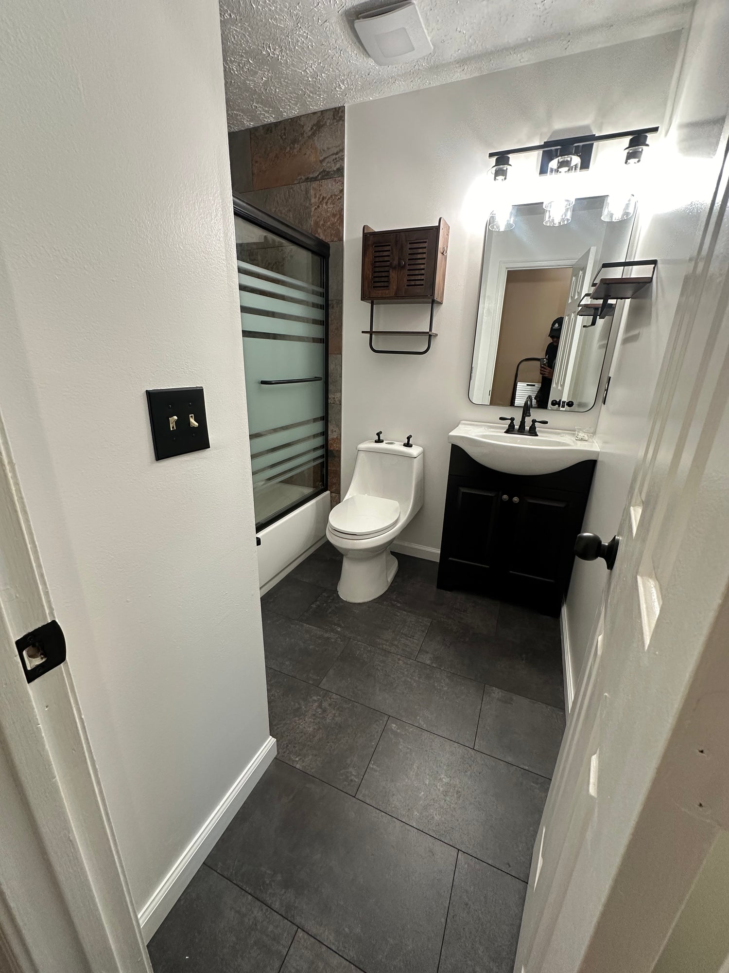 We modernized the look with sleek tile on the wall and floor, a fresh vanity, and a clean, bright aesthetic for a more open and updated feel.