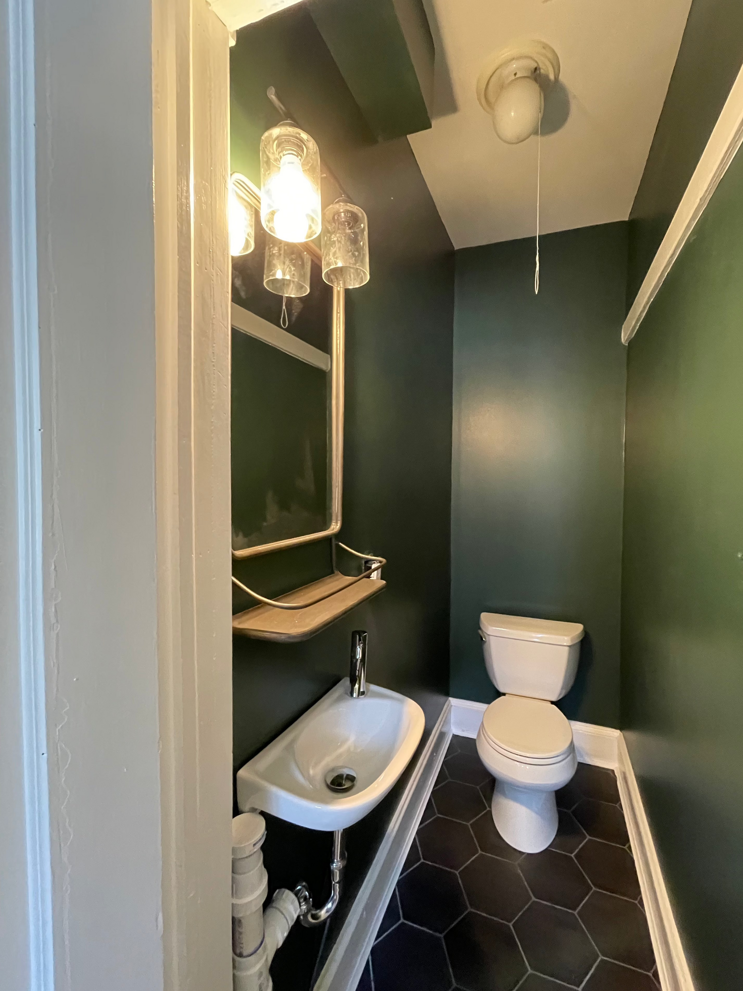 We transformed the old hallway into a stylish half bath, complete with a sleek vanity, modern fixtures, and a bold, elegant design.