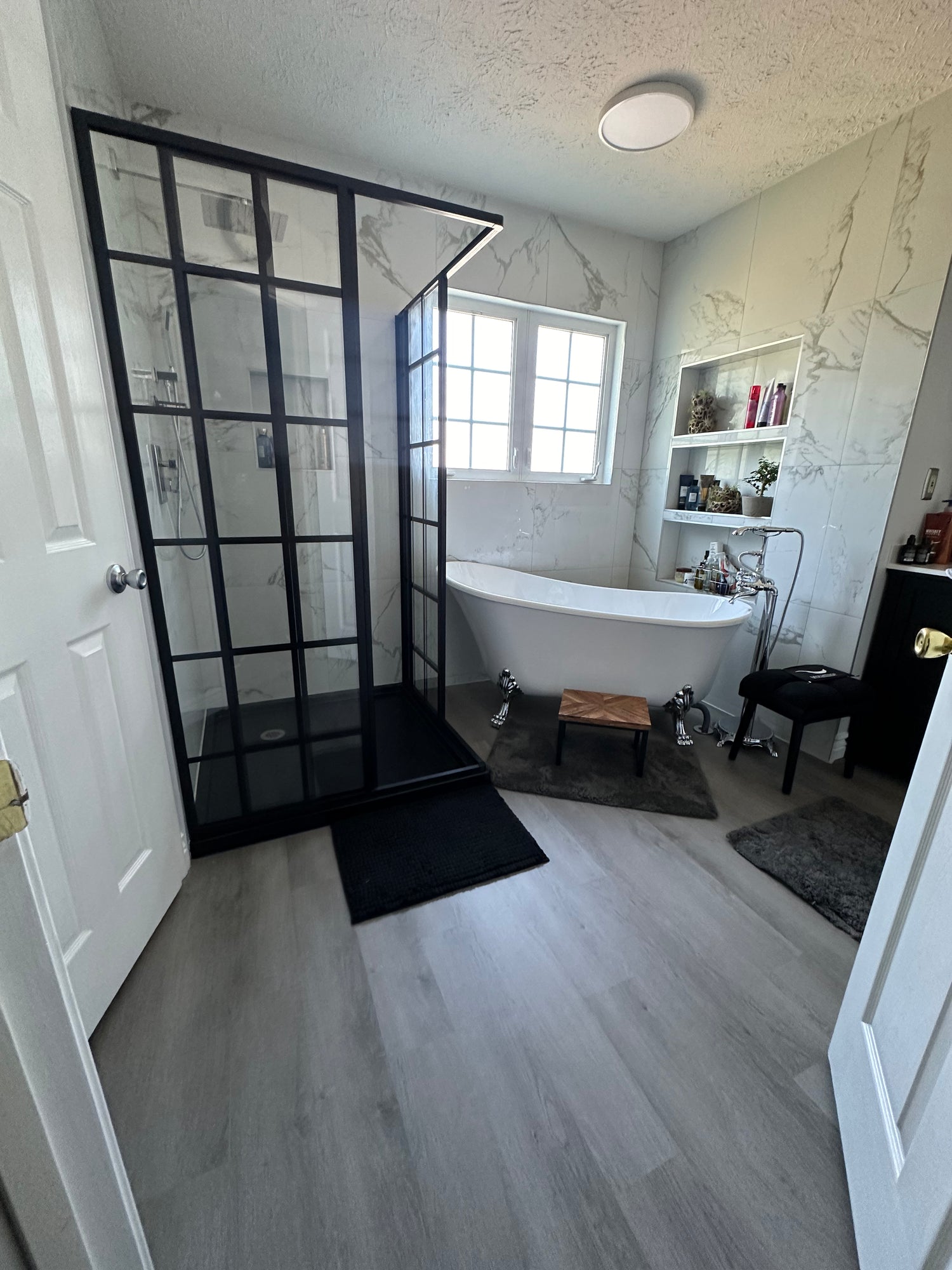 Now a spa-like oasis, this bathroom features a sleek black-framed shower, a freestanding tub, and elegant marble-style walls for a timeless, high-end look.
